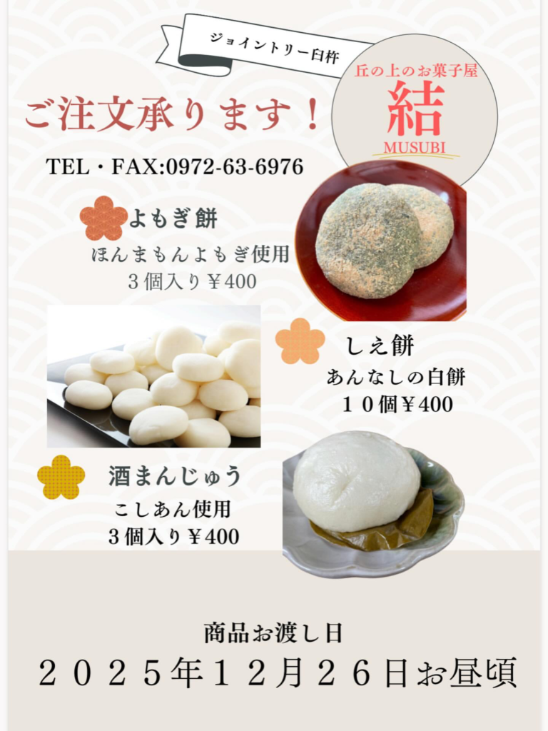 自然豊かな臼杵の地で育った、よもぎ、もち米を使用して和菓子を作っております。ぜひご賞味いただければ幸いです。